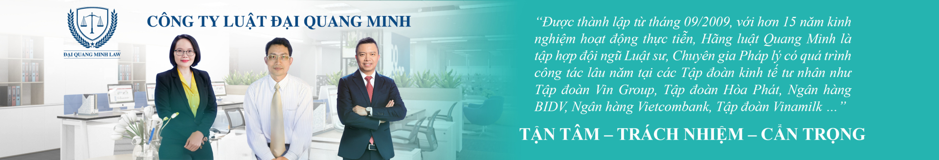 “Established in September 2009, with more than 15 years of practical experience, Quang Minh Law Firm brings together a team of lawyers and legal experts who have worked for many years at major private corporations such as Vingroup, Hoa Phat Group, BIDV Bank, Vietcombank, Vinamilk, and others.